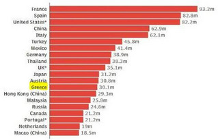 Για την Ελλάδα, που βρίσκεται στην 13η θέση της παγκόσμιας κατάταξης, ο Παγκόσμιος Οργανισμός Τουρισμού αναφέρει ότι κατά το 2018 στη χώρα σημειώθηκαν 30,1 εκατομμύρια αφίξεις, αυξημένες κατά 10,8% συγκριτικά με την προηγούμενη χρονιά.