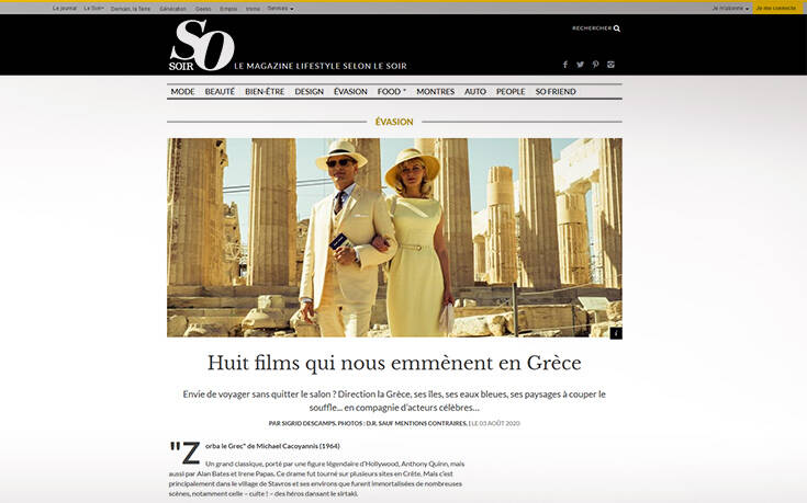 «Έχετε όρεξη να ταξιδέψετε χωρίς να εγκαταλείψετε το σαλόνι σας; Προορισμός η Ελλάδα, τα νησιά της, τα γαλάζια νερά της… έχοντας παρέα διάσημους ηθοποιούς» αναφέρει η «Soir» προτείνοντας μια σειρά κλασικών φιλμ και έχοντας αναρτήσει παράλληλα και αντίστοιχα βίντεο.