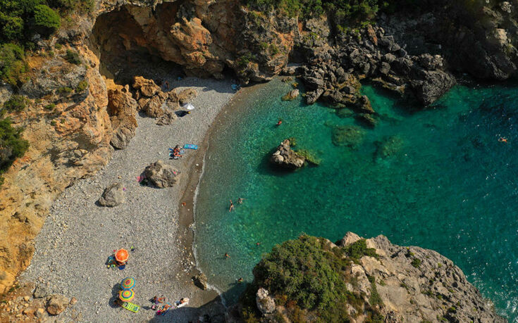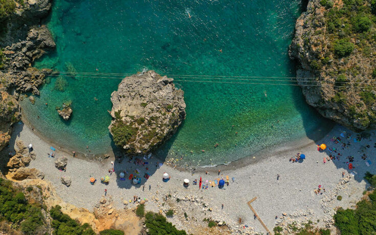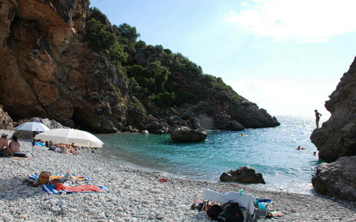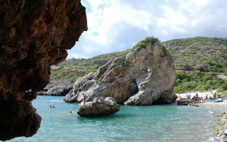 Πολλές στιγμές νομίζαμε ότι είμαστε σε νησί και μάλιστα σε κάποια απομονωμένη παραλία του Ιονίου. Θα καταλάβεις αυτό που σου λέμε από την πρώτη στιγμή που θα φτάσεις εκεί. Το πιο χαρακτηριστικό της παραλίας που θα το δεις και σε πολλές φωτογραφίες είναι ο μεγάλος βράχος που βρίσκεται εκεί. Είναι στα μέσα περίπου του κόλπου και από εκεί θα δεις πολλούς λουόμενους να κάνουν τις βουτιές τους.