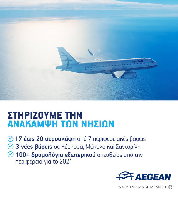 Με 33 νέα απευθείας δρομολόγια, που ενισχύουν σημαντικά τις βάσεις της εταιρείας στη Θεσσαλονίκη, το Ηράκλειο, τη Ρόδο, τα Χανιά, αλλά και τις 3 νέες βάσεις σε Κέρκυρα, Σαντορίνη και Μύκονο, συνολικά θα απασχολήσει 17 έως 20 αεροσκάφη, αποκλειστικά στην περιφέρεια. Με την επιλογή αυτή, η AEGEAN συμβάλει στις προϋποθέσεις για ανάκαμψη του τουρισμού προς την περιφέρεια. Παράλληλα, όπως πάντα, διατηρεί φυσικά τη βάση της Αθήνας με 37-40 αεροσκάφη, ως τον βασικό κόμβο δραστηριότητας του δικτύου της για την προσβασιμότητα και διασυνδεσιμότητα τόσο στην ηπειρωτική Ελλάδα, όσο και στα μικρότερα νησιά.