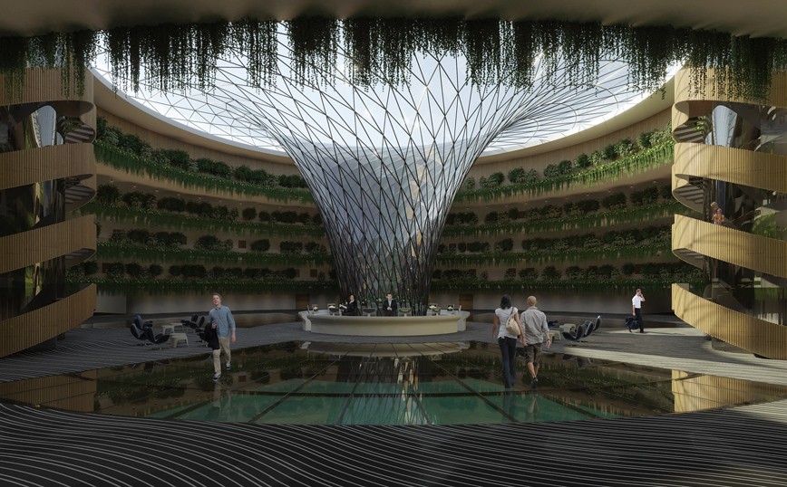 Το ξενοδοχείο, το οποίο τελικά θα εκτείνεται σε περίπου 8,6 στρέμματα, διαθέτει επίσης 55 κάθετες ανεμογεννήτριες που μπορούν να παράγουν 25kw ηλεκτρικής ενέργειας η καθεμία και να μετατρέπονται ως ομπρέλες για τους επισκέπτες. Ακόμη, η οροφή σε σχήμα δίνης δεν αποτελεί μόνο ένα εντυπωσιακό χαρακτηριστικό του φουτουριστικού ξενοδοχείου, αλλά βοηθά στη συλλογή του νερού της βροχής.
