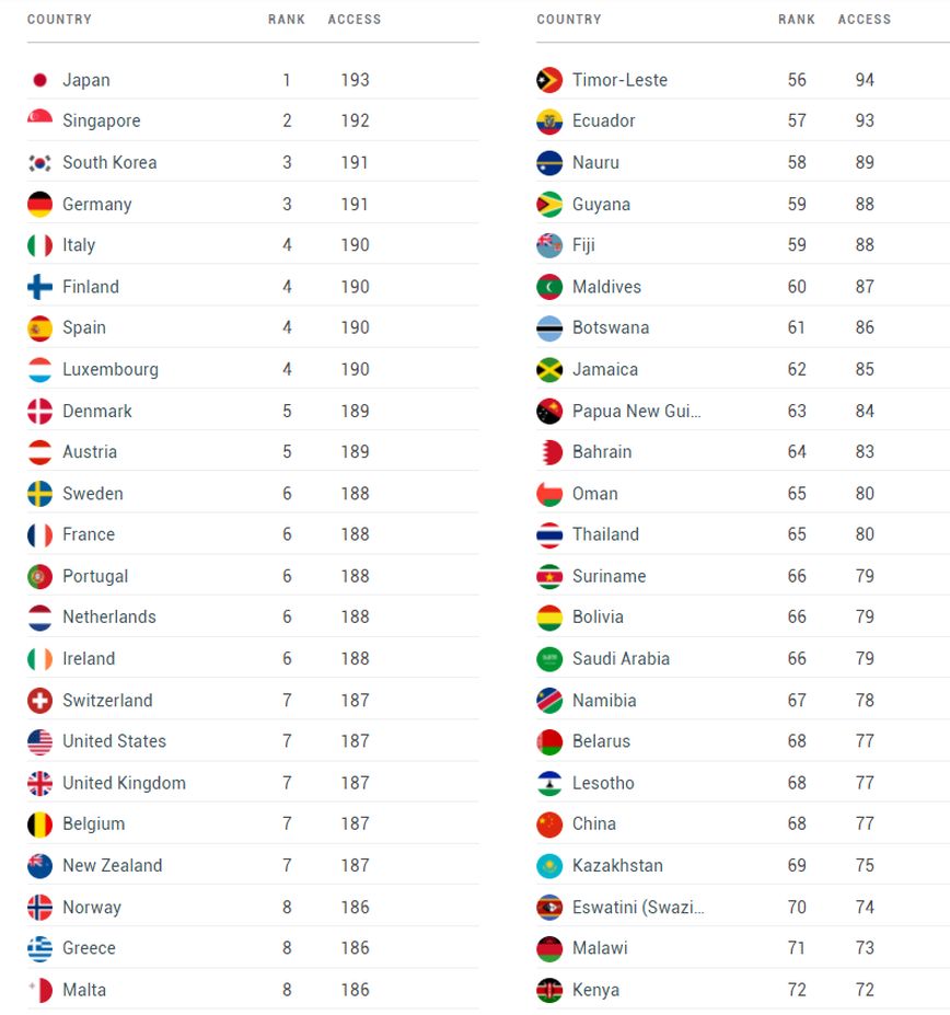 Η Σιγκαπούρη ακολουθεί την Ιαπωνία στη λίστα, καθώς οι κάτοχοι του διαβατηρίου της μπορούν να επισκεφτούν 192 χώρες. Νότια Κορέα και Γερμανία μοιράζονται την τρίτη θέση (191 χώρες).