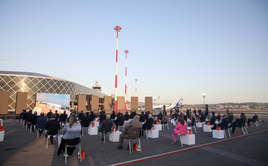 Από την εκδήλωση για τα λαμπρά εγκαίνια των 14 περιφερειακών αεροδρομίων, οι καλεσμένοι αλλά και όσοι παρακολούθησαν διαδικτυακά την τελετή είχαν την ευκαιρία να θαυμάσουν και μία συμβολική απογείωση αεροσκάφους.