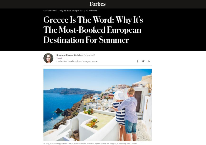 «Η Ελλάδα είναι ο κόσμος: Γιατί είναι στην κορυφή των κρατήσεων ανάμεσα στους ευρωπαϊκούς προορισμούς για το καλοκαίρι» είναι ο τίτλος δημοσιεύματος του Forbes, το οποίο αναφέρει πως την περασμένη εβδομάδα η Ευρωπαϊκή Ένωση ανακοίνωσε ότι τα κράτη μέλη της θα ανοίξουν σύντομα για τους εμβολιασμένους ταξιδιώτες από χώρες εκτός του μπλοκ, συμπεριλαμβανομένων των Αμερικανών.