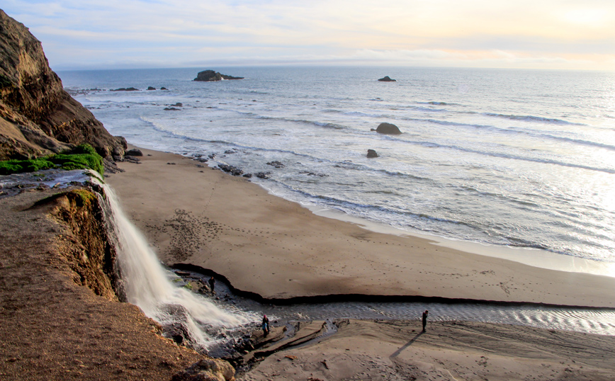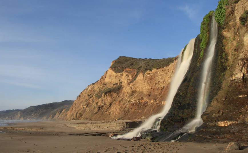 Η πτώση του νερού στην παραλία Wildcat πραγματοποιείται περίπου από ύψος 12 μέτρων, ενώ το ασυνήθιστο θέαμα του νερού καθώς πέφτει πάνω από τους κάθετους γκρεμούς σχιστόλιθου και καταλήγει στα νερά του Ειρηνικού Ωκεανού, συναντάται σε ένα αρκετά απομονωμένο σημείο στο νότιο άκρο της παραλίας Wildcat δίπλα σε ένα βραχώδες ακρωτήριο που ονομάζεται Double Point.