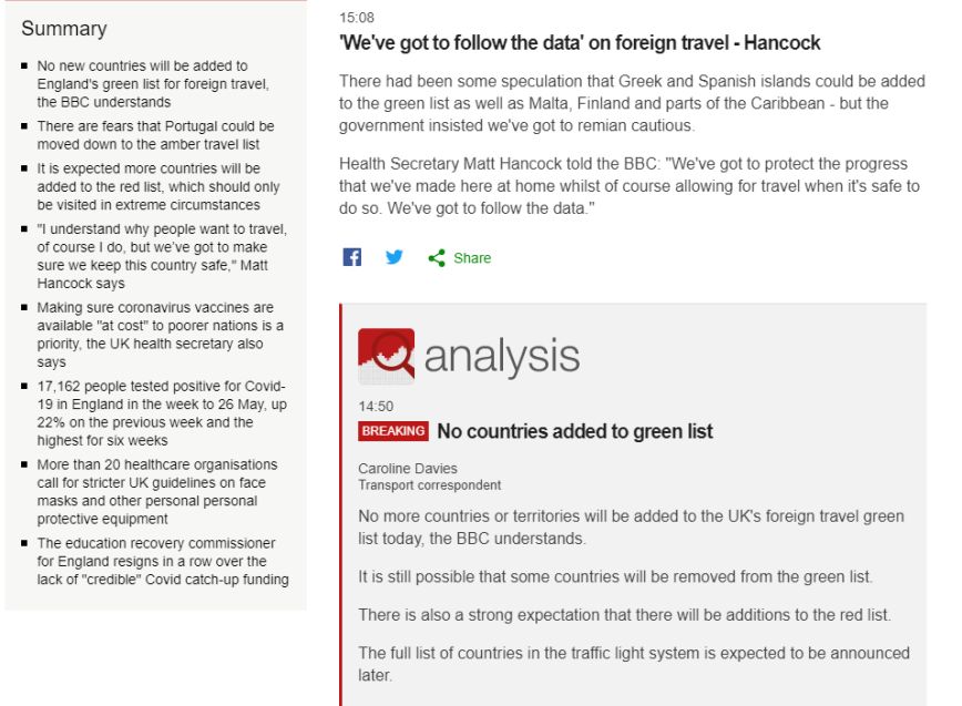Ο υπουργός Υγείας Ματ Χάνκοκ δήλωσε στο BBC: «Πρέπει να προστατεύσουμε την πρόοδο που έχουμε κάνει εδώ στη χώρα μας, επιτρέποντας παράλληλα τα ταξίδια όταν είναι ασφαλές να το κάνουμε. Πρέπει να ακολουθούμε τα δεδομένα».