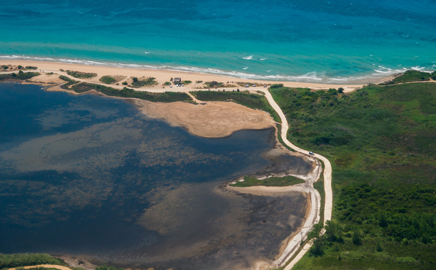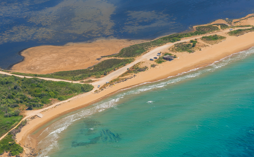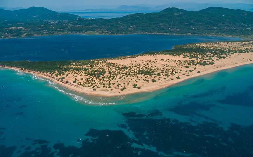 Απλωμένη για αρκετά χιλιόμετρα μέσα στο νερό μεταξύ της λίμνης Κορισσίων και του βόρειου Ιονίου, αν την παρατηρήσει κανείς από ψηλά δίνεται η εντύπωση ότι πρόκειται για μια φυσική αμμόγλωσσα που διεισδύει στα νερά της θάλασσας δημιουργώντας εκπληκτικές εικόνες, που σπάνια συναντά κανείς αλλού.