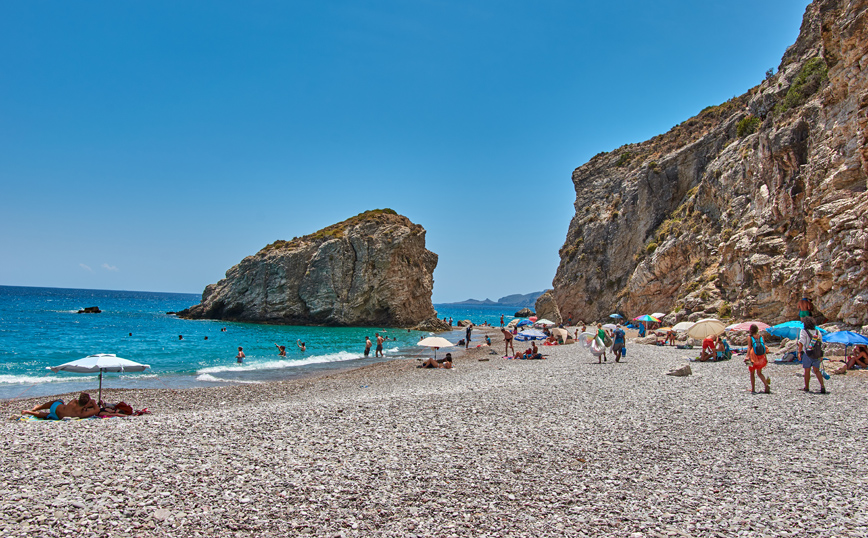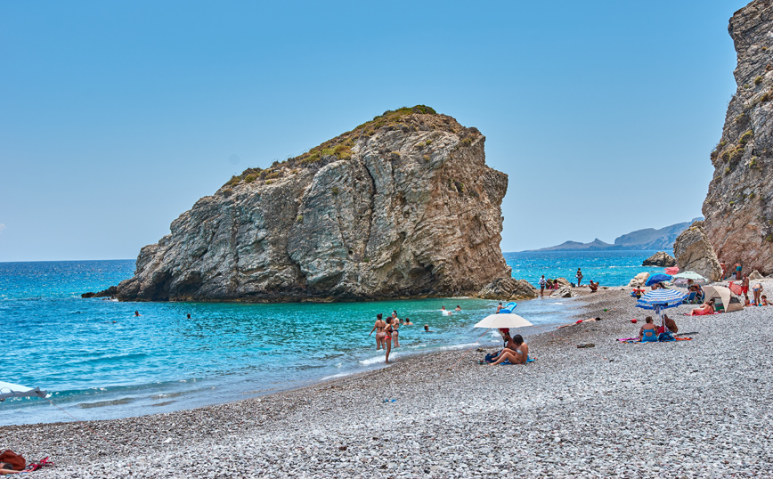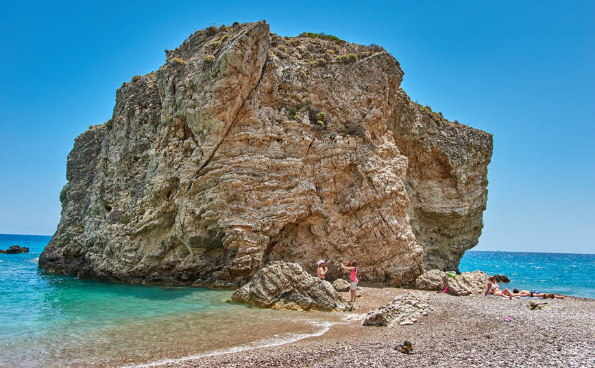 Στην ουσία πρόκειται για τρεις διαδοχικές ακρογιαλιές, με τη μεσαία -εκεί όπου εντοπίζεται και ο τεράστιος βράχος- να είναι και η μεγαλύτερη, και τις άλλες δύο εκατέρωθεν να αποτελούν επιλογές για πιο απομονωμένες βουτιές. Με βότσαλο και ονειρικά νερά, ψεύτικα σαν πισίνας θαρρείς, προσφέρονται για ειδυλλιακές βουτιές μακριά από την πολυκοσμία. Η πιο πριβέ είναι αυτή στο δεξί σας χέρι, έτσι όπως βλέπετε την θάλασσα, την οποία προσεγγίζετε μέσα από μια μικρή σπηλιά.