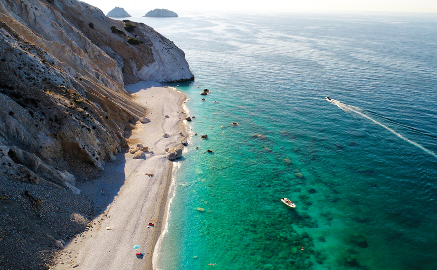 Ένας μεγαλοπρεπής και επιβλητικός κατακόρυφος βράχος λειτουργεί ως είδος απομόνωσης της παραλίας από το υπόλοιπο νησί, ο οποίος ξεκινάει από την κορυφή μιας πλαγιάς και καταλήγει σχεδόν ορμητικός πίσω από το σημείο της ακτής.