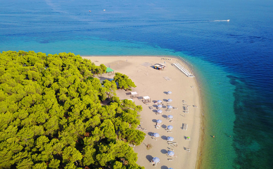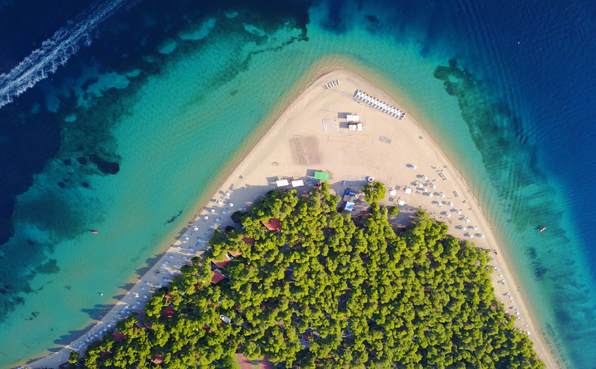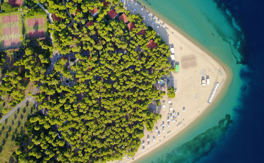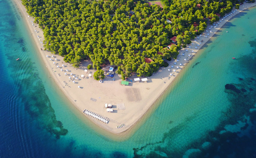 Μια χρυσαφένια αμμόγλωσσα που λαμπιρίζει, «σκίζει» τα γαλαζοπράσινα νερά της θάλασσας, δημιουργώντας εξωτικές εικόνες που παραπέμπουν σε μέρη μακρινά. Το όλο ονειρικό σκηνικό ολοκληρώνεται με τα αμέτρητα και φουντωτά καταπράσινα πεύκα που αγγίζουν, σχεδόν, τη θάλασσα. Μια εικόνα που σίγουρα θα μπορούσε πολύ εύκολα να αντικρίσει κανείς σε κάποιον εξωτικό προορισμό. Και για να ευλογήσουμε λίγο και τα γένια μας ως Έλληνες, ίσως και καλύτερη από οποιοδήποτε εξωτικό προορισμό.