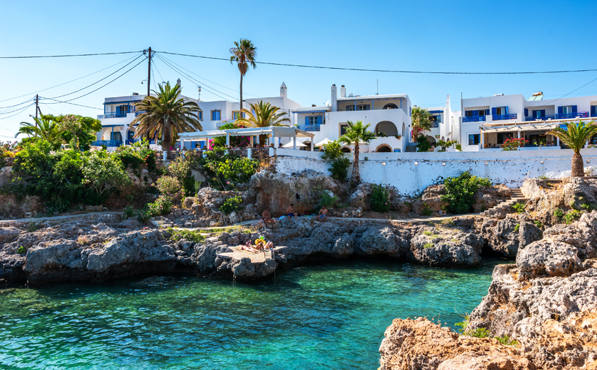 Η κινηματογραφική, θα έλεγε κανείς, παραλία του χωριού με τα χαρακτηριστικά βράχια ολόγυρά της, συνθέτει ένα σκηνικό που μεταφέρει μαγικά στη δεκαετία του ΄60 με τους λουόμενους να απολαμβάνουν την ηλιοθεραπεία τους πάνω στα βράχια και να πραγματοποιούν βουτιές στα κρυστάλλινα, τιρκουάζ νερά του μικρού κολπίσκου, που μοιάζει με πισίνα, απευθείας από αυτά.