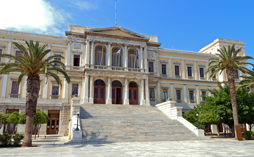 Εντυπωσιακότερο όλων τον περίφημο Δημαρχείο στην Πλατεία Μιαούλη, το οποίο σχεδιάστηκε από τον Ερνέστο Τσίλερ στα τέλη του 19ου αιώνα. Πρόκειται για ένα από τα πιο εμβληματικά δημαρχεία της Ελλάδας και φέρει ιονικά στοιχεία, καθώς και επιρροές από την Τοσκάνη.
