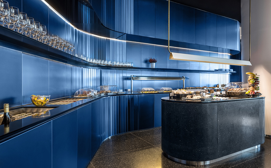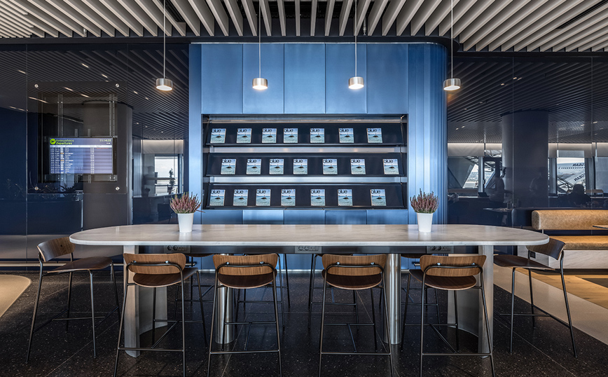 Οι καμπύλες μορφές οι οποίες κυριαρχούν σε συνδυασμό με τα υλικά υψηλής ποιότητας όπως το μάρμαρο, το μωσαϊκό, το γυαλί και το ξύλο δημιουργούν ένα σύγχρονο και μοντέρνο χώρο που εστιάζει αποκλειστικά στην άνεση και τη φιλοξενία, ενώ η ειδική πύλη μέσα στο lounge εξασφαλίζει την απευθείας επιβίβαση στο αεροσκάφος.