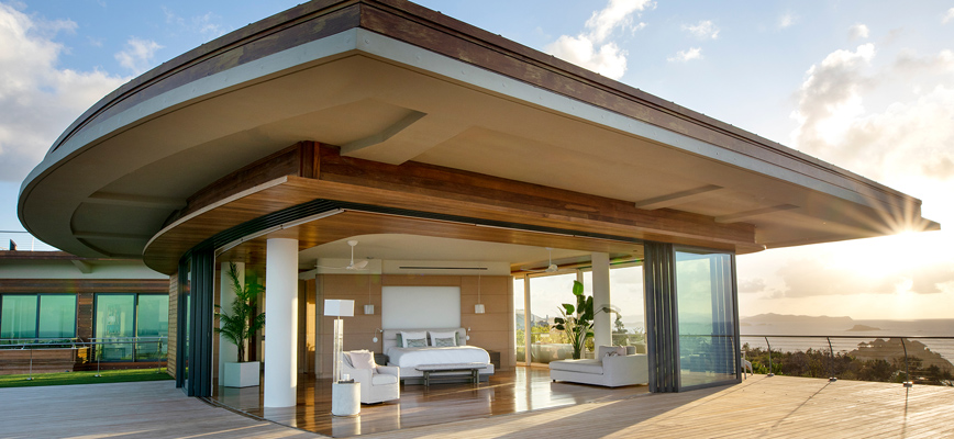 Το κτίριο των εννέα υπνοδωματίων -είναι εντελώς σύγχρονο με κομψές και έντονες γραμμές, πρωτοποριακή χρήση φυσικών υλικών και παράθυρα από το δάπεδο μέχρι την οροφή- ενσωματώνει αριστοτεχνικά την αισθητική του Μπράνσον στο σχεδιασμό. Ο Sinesi, μάλιστα, εξηγεί στο architecturaldigest.com ότι «Το σπίτι έχει σχεδιαστεί με έντεχνες μορφές. Τα σχήματα συνδυάζονται με κυβιστικό τρόπο που δημιουργεί διάμεσους χώρους με αλληλεπικαλυπτόμενες μορφές. Υπάρχει μια σαφής πρόθεση βιοφιλικού σχεδιασμού με μικτούς εσωτερικούς και εξωτερικούς χώρους διαβίωσης».
