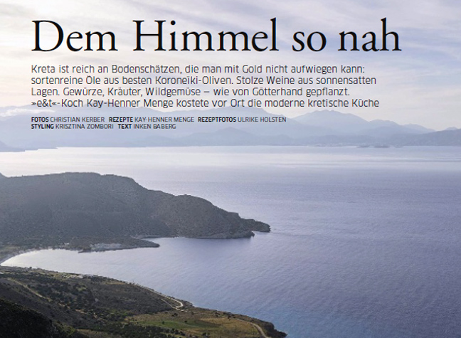 Σε ένα μοναδικό δεκασέλιδο αφιέρωμα το κορυφαίο γερμανικό περιοδικό γαστρονομίας «Essen & Trinken» ανακαλύπτει τον πλούτο της κρητικής κουζίνας, ο οποίος, όπως σημειώνει ο δημοσιογράφος, «δεν μπορεί να αγοραστεί ούτε με χρυσό».