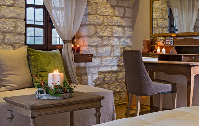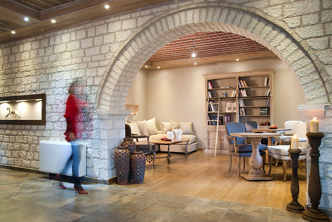Τόσο οι πέτρινες καµάρες και τα country style έπιπλα, όσο και το επιβλητικό µοναστηριακού τύπου τραπέζι της reception και η ξύλινη σκάλα που οδηγεί στα ενδότερα συνωµοτούν στο να νιώσουµε αµέσως οικεία.
