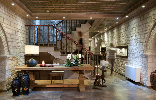 Το κεντρικό πέτρινο αρχοντικό που το στεγάζει, πιστό στην τοπική αρχιτεκτονική, µοιάζει µε φυσική συνέχεια του οικισµού, δίνοντας την αίσθηση σπιτιού. Την ίδια θαλπωρή νιώθουµε µε το που διασχίζουµε την επιβλητική του πόρτα και αντικρίζουµε το εντυπωσιακό lobby.