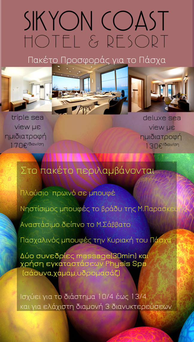 Από την Μεγάλη Απριλίου 10 Μαρτίου μέχρι και την Δευτέρα του Πάσχα 13 Απριλίου, η ομάδα του Sikyon Coast θα φροντίσει ώστε οι πασχαλινές σας διακοπές να σας μείνουν αξέχαστες.
