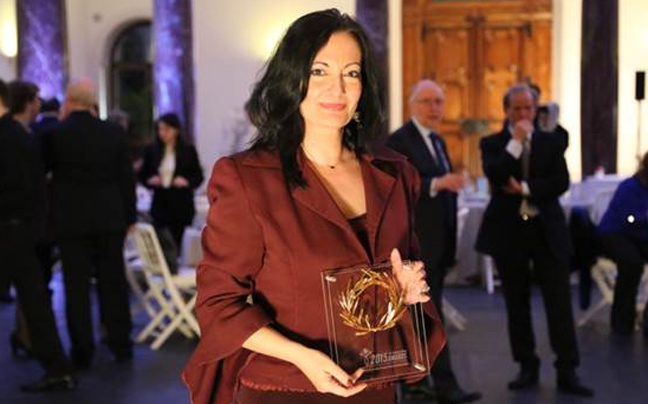 Η διευθύντρια Επικοινωνίας & Μάρκετινγκ του ΔΑΑ, Ιωάννα Παπαδοπούλου, με το βραβείο του αεροδρομίου της Αθήνας.
