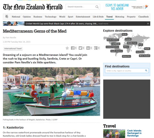 Αφιέρωμα στα «Διαμάντια της Μεσογείου» έκανε η εφημερίδα New Zealand Herald, συμπεριλαμβάνοντας σε αυτά το Καστελόριζο, τη Σύμη και τη Θάσο. Στη σχετική λίστα του δημοσιεύματος περιλαμβάνονται και τρία ιταλικά νησιά.