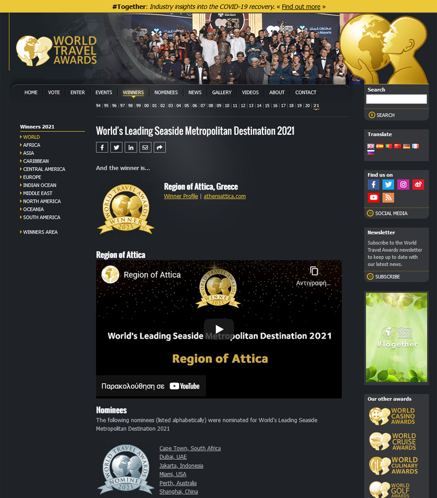 Την πρώτη θέση κατέκτησε η Αττική στην κατηγορία «World’s Leading Seaside Metropolitan Destination», των World Travel Awards, ως ο κορυφαίος Μητροπολιτικός Παραθαλάσσιος Προορισμός για το 2021. Ο θεσμός βραβεύει τους πρωταγωνιστές της τουριστικής βιομηχανίας και αναγνωρίζεται ως το απόλυτο σήμα κατατεθέν της ταξιδιωτικής βιομηχανίας, διεθνώς.