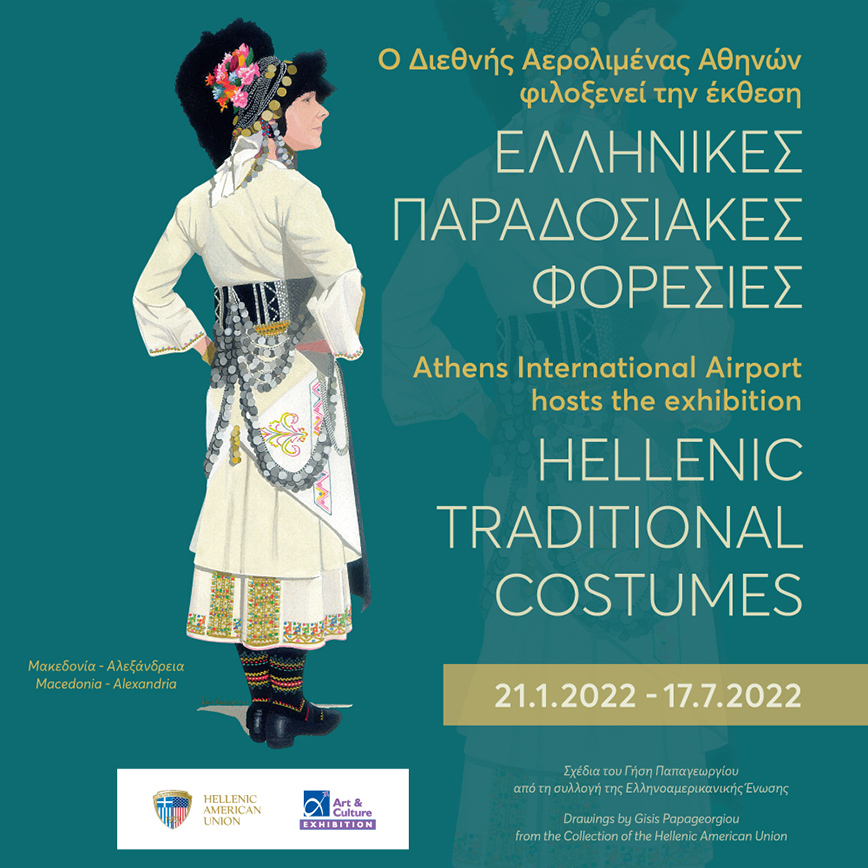 Ο Διεθνής Αερολιμένας Αθηνών και η Ελληνοαμερικανική Ένωση παρουσιάζουν την έκθεση «Ελληνικές Παραδοσιακές Φορεσιές» με σχέδια του Γήση Παπαγεωργίου σε επιμέλεια της ιστορικού τέχνης Λουΐζας Καραπιδάκη. Η έκθεση πραγματοποιείται από 21 Ιανουαρίου έως και 17 Ιουλίου 2022, στον εκθεσιακό χώρο «Τέχνη & Περιβάλλον» στο επίπεδο αναχωρήσεων του Διεθνούς Αερολιμένα Αθηνών. Η πρόσβαση για το κοινό είναι ελεύθερη.