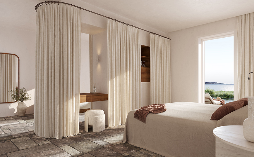 αρχετυπικού ελληνικού καλοκαιριού, την πεμπτουσία του Greeknessence, σε μια εκλεπτυσμένη πραγματικότητα για τον σύγχρονο ταξιδιώτη, μιλώντας κατευθείαν στην καρδιά του, διατηρώντας ωστόσο τον γνήσιο χαρακτήρα της θρυλικής εκείνης δεκαετίας. Το αποτέλεσμα είναι ένας γοητευτικός διάλογος μεταξύ των αέρινων εσωτερικών χώρων του κτιρίου με τον έντονα γραμμικό ρυθμό και των εκπληκτικών εξωτερικών χώρων με τη θέα τη Δήλο, τη γενέτειρα του φωτός, σε μια απόλυτη σύνδεση των τεσσάρων στοιχείων της φύσης: αέρας, γη, νερό και φωτιά.