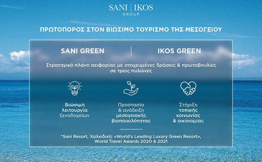 Στα θέρετρα από 21 χώρες που παρουσιάζει η έρευνα της αθηΝΕΑς, περιλαμβάνεται και το Sani Resort στην Κασσάνδρα Χαλκιδικής, που το 2021 -για δεύτερη συνεχόμενη χρονιά- αναδείχθηκε «κορυφαίο περιβαλλοντικό συγκρότημα παγκοσμίως» στον θεσμό των World Travel Awards. Ο Όμιλος Sani / Ikos έχει αναπτύξει ένα στρατηγικό πλάνο αειφορίας, με τα προγράμματα Sani Green και Ikos Green, που εστιάζουν σε τρεις άξονες: τη βιωσιμότητα στη λειτουργία των ξενοδοχείων Sani και Ikos, την προστασία της βιοποικιλότητας σε όλες τις περιοχές της Μεσογείου όπου δραστηριοποιείται και τη στήριξη της τοπικής κοινωνίας και οικονομίας.