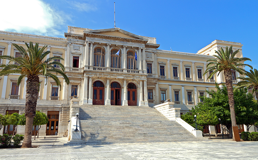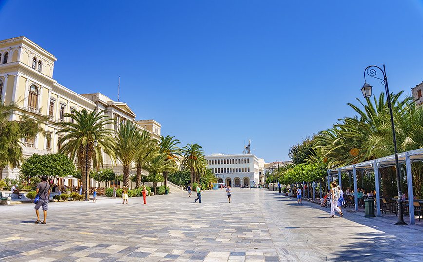 Εντυπωσιακότερο όλων τον περίφημο Δημαρχείο στην Πλατεία Μιαούλη, το οποίο σχεδιάστηκε από τον Ερνέστο Τσίλερ -τον πρωτοπόρο αρχιτέκτονα που μεταμόρφωσε την Αθήνα– στα τέλη του 19ου αιώνα. Πρόκειται για ένα από τα πιο εμβληματικά δημαρχεία της Ελλάδας και φέρει ιονικά στοιχεία, καθώς και επιρροές από την Τοσκάνη.