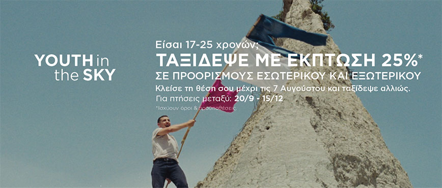 Η αεροπορική της νέας εποχής προσφέρει έκπτωση 25%*, σε όλους τους ενδιαφερόμενους από 17 έως 25 ετών, για να ζήσουν την εμπειρία της πτήσης με τον νεότερο και πιο πράσινο στόλο της χώρας και έναν από τους πιο φιλοπεριβαλλοντικούς της Ευρώπης.