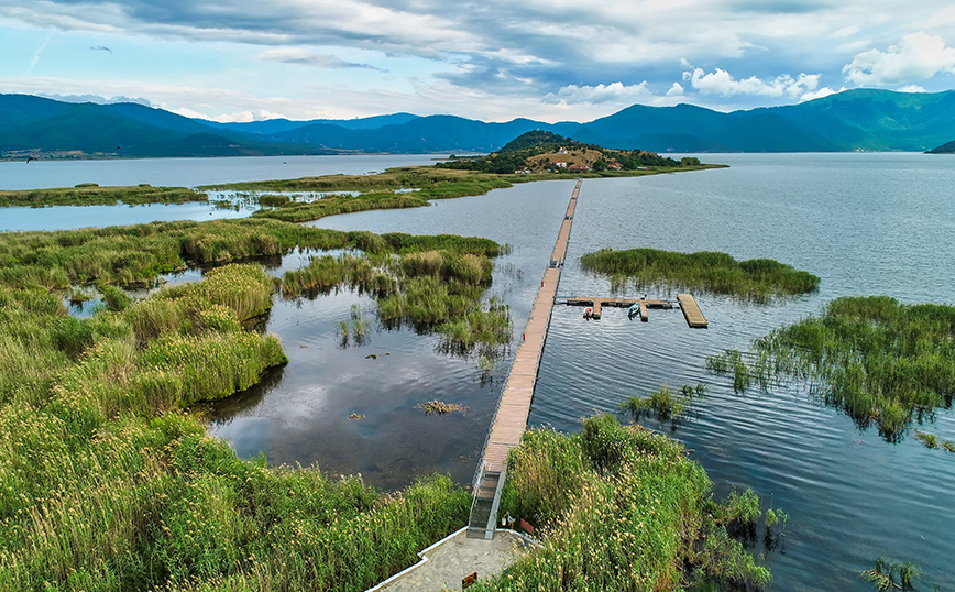 Μία από τις πιο χαρακτηριστικές εικόνες, λοιπόν, που αντικρίζει ο επισκέπτης της περιοχής, είναι η ξύλινη γέφυρα που οδηγεί στο νησάκι του Αγίου Αχιλλείου, το οποίο μοιάζει να πλέει στα νερά της Μικρής Πρέσπας.