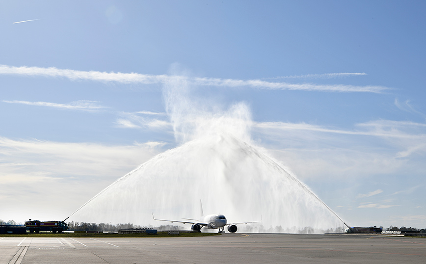 Οι εκπρόσωποι του αεροδρομίου του Μονάχου υποδέχθηκαν με τον καλύτερο τρόπο την γεμάτη επιβάτες πρώτη πτήση με παραδοσιακές στολές, το καθιερωμένο water salut, αλλά και τοπικά γλυκίσματα κατά την αποβίβαση.