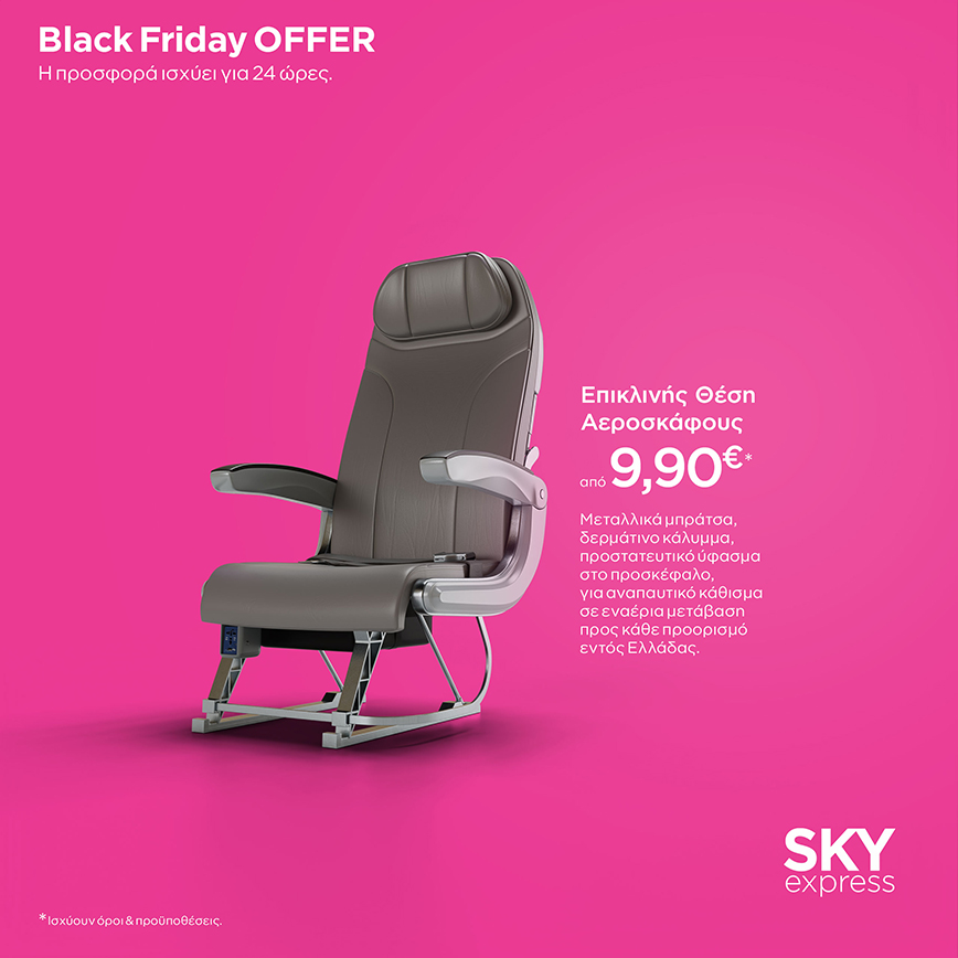 Μόνο για σήμερα 25 Νοεμβρίου, οι ενδιαφερόμενοι έχουν την ευκαιρία να επιλέξουν έναν ή και περισσότερους από τους 34 προορισμούς εσωτερικού που εξυπηρετεί η SKY express και να κάνουν την κράτησή τους από μόνο €9.90.