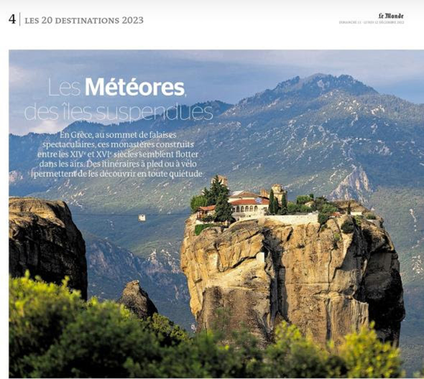 Ανάμεσα στους 20 κορυφαίους προορισμούς σε όλο τον κόσμο, που πρέπει κάποιος να επισκεφθεί μέσα στο 2023, περιλαμβάνονται τα Μετέωρα, σύμφωνα με μεγάλο αφιέρωμα της γαλλικής εφημερίδας Le Monde.