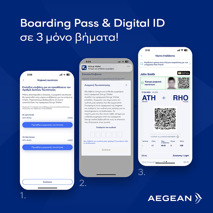 Η AEGEAN αξιοποιεί τις δυνατότητες του gov.gr και φέρνει πρώτη στην Ελλάδα την υπηρεσία «Digital ID», καθιστώντας ακόμη πιο γρήγορο και εύκολο τoν έλεγχο των στοιχείων των επιβατών κατά την επιβίβασή τους. Η νέα υπηρεσία που είναι πλέον διαθέσιμη μέσω του AEGEAN App, επιτρέπει στους επιβάτες εσωτερικού της AEGEAN και της OLYMPIC Air μετά την πραγματοποίηση του check in και σε μόλις λίγα, απλά βήματα να ενσωματώσουν τα στοιχεία της ταυτότητάς τους στην ψηφιακή κάρτα επιβίβασης. Με τον τρόπο αυτό επιτυγχάνεται η άμεση ταυτοποίηση των στοιχείων του κάθε επιβάτη, επισπεύδοντας και απλουστεύοντας τη διαδικασία ελέγχου κατά την επιβίβαση.