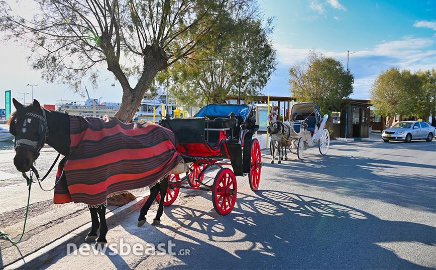 Λίγο πιο κάτω στέκουν οι πάγκοι με τα φιστίκια και όλα τα παραδοσιακά προϊόντα του νησιού αλλά και οι άμαξες που περιμένουν να ξεναγήσουν τους επισκέπτες.