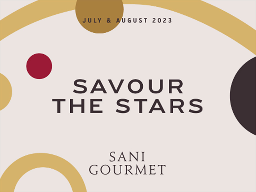 Με κεντρικό θέμα “Savour the Stars” και μία ατζέντα 5 ξεχωριστών δείπνων που θα πραγματοποιηθούν από τις 7 Ιουλίου έως τις 12 Αυγούστου στα εστιατόρια Elia και Water του Sani Resort, το Sani Gourmet γίνεται ένα σημείο συνάντησης για δημιουργούς και λάτρεις της υψηλής γαστρονομίας. Στο “Savour the Stars” του Sani Gourmet η A-list της haute cuisine θα δημιουργήσει degustation menus από διαφορετικές κουζίνες (γαλλική, modern, fusion), με έμπνευση από́ εμβληματικά και αγαπημένα signature πιάτα συνοδευόμενα από επιλεγμένες λίστες εκλεπτυσμένων κρασιών ελληνικών και ξένων αμπελώνων, απαντώντας στις πιο υψηλές γαστρονομικές απαιτήσεις. Συγκεκριμένα: