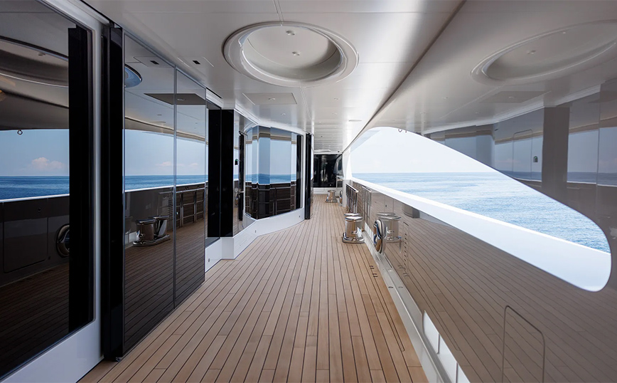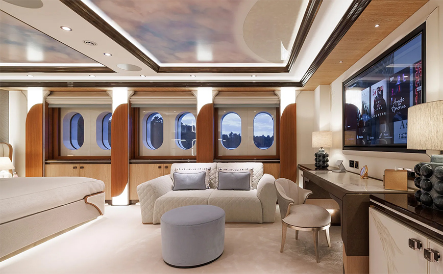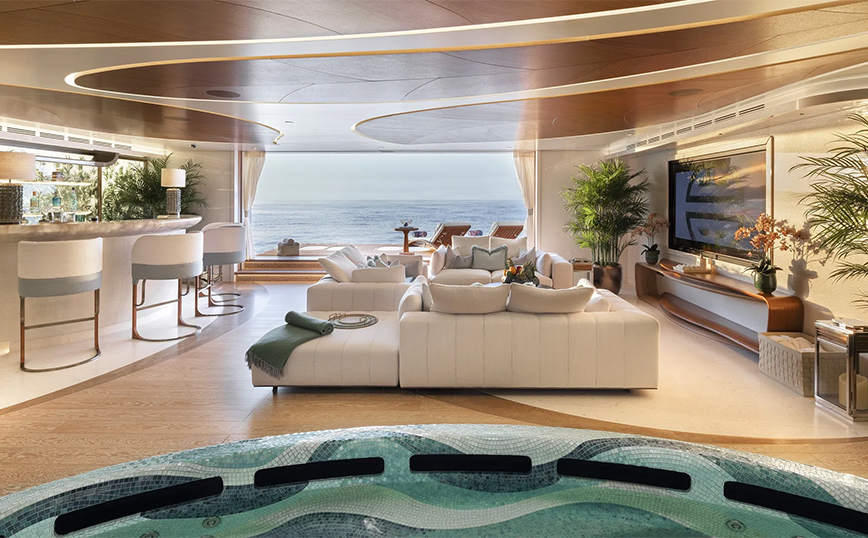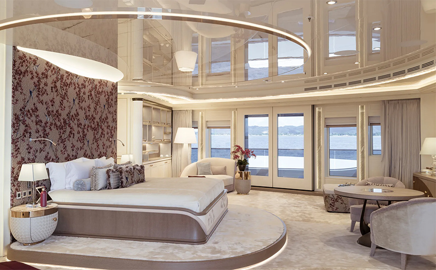 Τα κεντρικά διαμερίσματα, διώροφα για την ακρίβεια, διαθέτουν γυμναστήριο με τελευταίας τεχνολογίας όργανα, ελικοδρόμιο και φυσικά βεράντες που ξεπερνούν τα 100 μέτρα σε διάμετρο. Τα… έξτρα του γιοτ δεν σταματούν εκεί. Περιλαμβάνει σπα με δωμάτιο μασαζ, σάουνα φτιαγμένη με ελεφαντόδοντο, ελαιόδεντρα διάσπαρτα, έργα τέχνης και πολυελαίους, beach bar, σινεμά 12 θέσεων και έναν… χειμωνιάτικο κήπο!