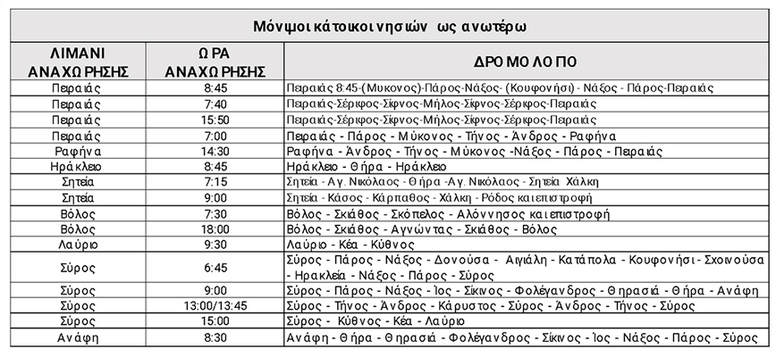 20% έκπτωση στα εισιτήρια επιβάτη σε όλα τα νησιά του Αιγαίου στα δρομολόγια όπως αναφέρονται στον παρακάτω πίνακα. (Για τους μόνιμους κατοίκους Δωδεκανήσων έκπτωση 40% στη γραμμή Σητεία – Δωδεκάνησα).