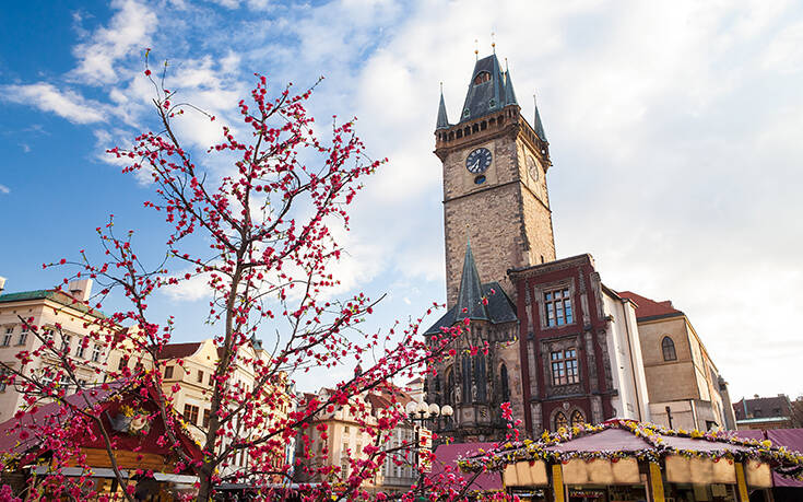 Ανθισμένα και πολύχρωμα λουλούδια μπροστά στον Πύργο του Ρολογιού, στην Παλιά Πόλη της Πράγας