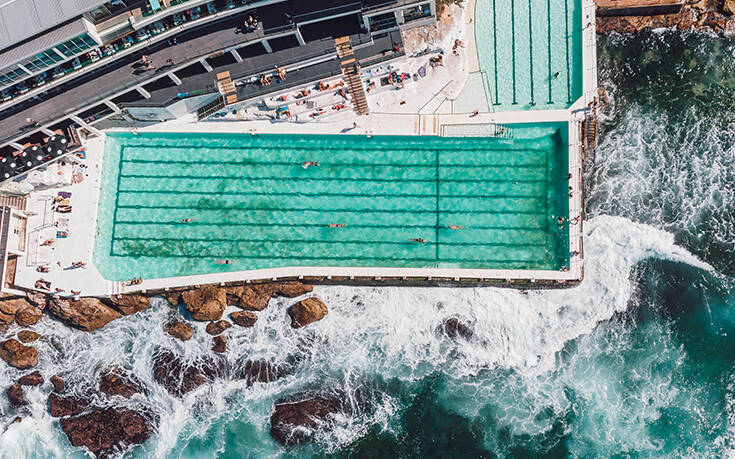 Σκαρφαλωμένη πάνω σε βράχια και με φόντο τα άγρια νερά του ωκεανού, τα κύματα του οποίου σκάνε πάνω της, η Bondi Icebergs στο Σίδνεϊ είναι η πιο πολυφωτογραφημένη πισίνα στον κόσμο, σύμφωνα με το Swim the World.