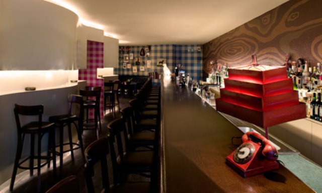 Ο εσωτερικός χώρος έχει χαμηλό φωτισμό, δερμάτινους, κόκκινους καναπέδες, που θυμίζουν κάτι από τη δεκαετία του 1920.