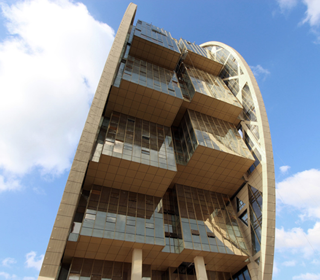 Τα μπροστινά και πίσω τοιχώματα του κτηρίου έχουν επίστρωση από πλάκες χαλκού, ενώ τα καμπύλα πλευρικά τοιχώματα είναι φτιαγμένα από κυβικές γυάλινες δομές.