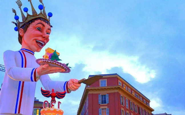 Το φετινό Καρναβάλι είναι αφιερωμένο στην κουζίνα της Νίκαιας και ο βασιλιάς Καρνάβαλος μετατρέπεται θεαματικά σε βασιλιά της Γαστρονομίας, φορώντας ένα περίτεχνο στέμμα με πιρούνια και κρατώντας ένα πιάτο με ένα κομμάτι τούρτα στο ένα χέρι και μια σπάτουλα σερβιρίσματος στο άλλο!