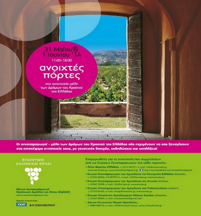 Το Σάββατο 31 Μαϊου και την Κυριακή 1η Ιουνίου, από τις 11 το πρωί έως τις 6 απόγευμα, οι Έλληνες οινοπαραγωγοί υποδέχονται τους φίλους του κρασιού στα οινοποιεία τους, προσφέροντας δωρεάν ξεναγήσεις και γευστικές δομικές.