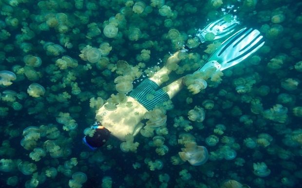 Οι χρυσές μέδουσες στα νερά αυτής της απομονωμένης λίμνης έχουν χάσει την ικανότητα τους να τσιμπούν και έτσι οι κολυμβητές δεν κινδυνεύουν.
