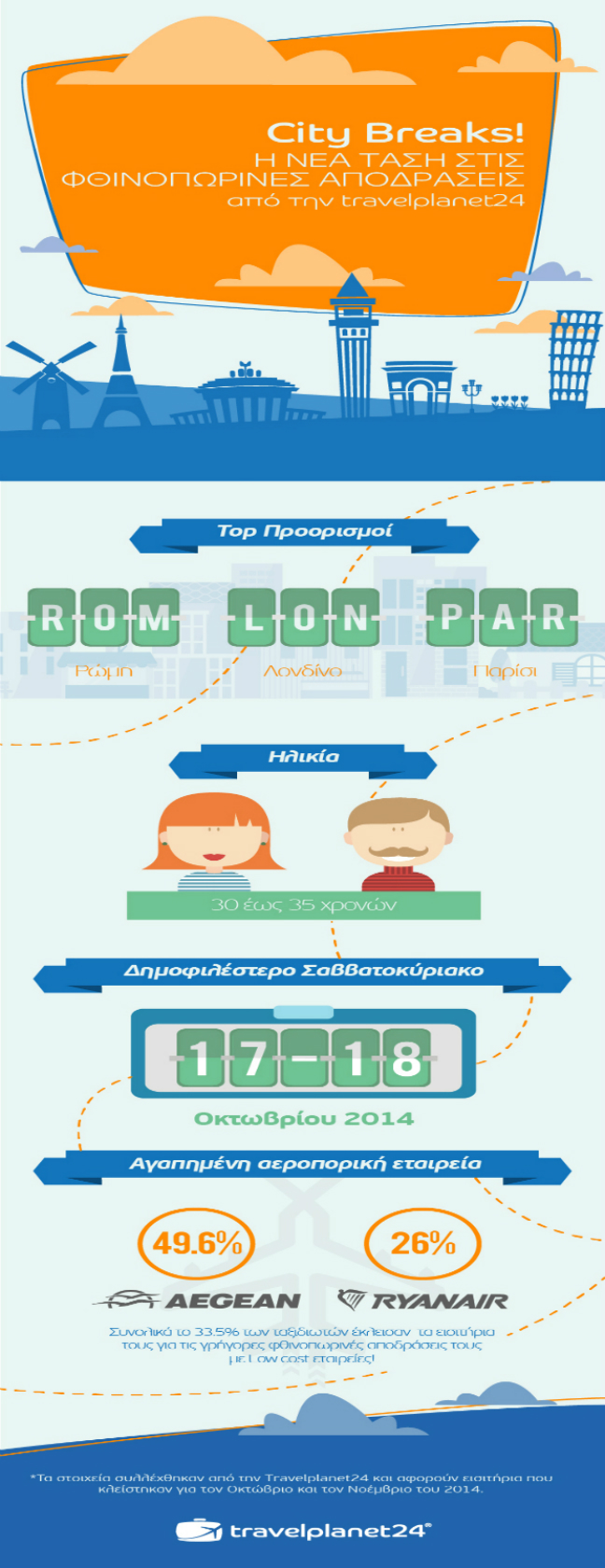 *Τα στοιχεία συλλέχθηκαν από την Travelplanet24 και αφορούν εισιτήρια που κλείστηκαν για τον Οκτώβριο και τον Νοέμβριο του 2014 για ολιγοήμερες αποδράσεις με διαμονή 3 ή 4 ημερών.