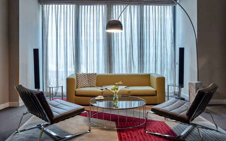Η εξωτερική, σκοτεινή πρόσοψη δεν προδιαθέτει σε καμία περίπτωση για την εσωτερική φωτεινότητα του ξενοδοχείου, καθώς ένα από τα βασικά χαρακτηριστικά του είναι το άπλετο φως που διαχέεται στους άνετους χώρους του.