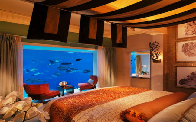 Το πολυτελές ξενοδοχείο Atlantis The Palm στο Ντουμπάι περιλαμβάνει δυο υποβρύχιες σουίτες, τις the Neptune και Poseidon. Αυτά τα πολυτελή καταλύματα διαθέτουν ιδιωτικό μπάτλερ, καθώς και μια εξαιρετική θέα στην υδρόβια ζωή της γιγάντιας, τεχνητής λιμνοθάλασσας του resort. Κι αν νομίζετε ότι οι σουίτες είναι μικρές και σκοτεινές, σας ενημερώνουμε ότι είναι μοιρασμένα σε τρεις ορόφους, μπορούν να φιλοξενήσουν έως και πέντε άτομα και διαθέτουν ένα ευρύχωρο σαλόνι. Η μια βραδιά θα σας κοστίσει 6.465 ευρώ και η τιμή περιλαμβάνει δωρεάν μασάζ, προσωπικό γυμναστή και δωρεάν πρόσβαση στο νυχτερινό κέντρο του ξενοδοχείου. Θα έχετε επίσης τη δική σας ξαπλώστρα στην πισίνα ή την παραλία για όλη τη μέρα, καθώς και δωρεάν πρόσβαση στο υποβρύχιο ενυδρείο Lost Chambers, ένα δαιδαλώδες κτίριο με καρχαρίες, χέλια, ιππόκαμπους και πιράνχας, καθώς και στο 42 στρεμμάτων πάρκο αναψυχής Aquaventure.