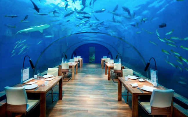 Το ξενοδοχείο Conrad Maldives Rangali διαθέτει 50 βίλες πάνω στο νερό και 79 βίλες δίπλα στην παραλία κοντά στο νησί Rangalifinolhu στις Μαλδίβες. Για να απολαύσετε μια υποβρύχια εμπειρία κλείστε τραπέζι στο εστιατόριο είναι Ithaa Undersea. Εκεί θα έχετε την ευκαιρία να γευτείτε ένα απολαυστικό μενού έξι πιάτων, σε ένα ειδικά διαμορφωμένο χώρο, δεκαπέντε μέτρα κάτω από την επιφάνεια της θάλασσας. Τα θαλασσινά είναι η σπεσιαλιτέ του εστιατορίου και η εμπειρία που θα ζήσετε, τρώγοντας με τη συντροφιά ενός καρχαρία θα είναι απλά αξέχαστη.